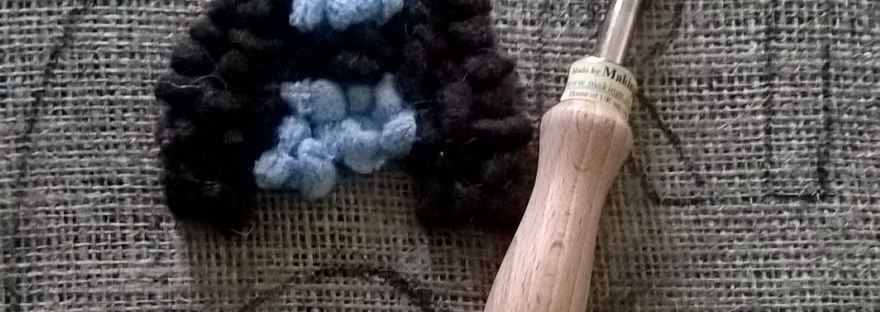E94D52C4-7EA7-4E85-8F8D-A94B46748589Occasionally at our Wednesday Arts Cafè we discover that there is something that we’d all like to have a go at.  After watching the recent BBC Four series MAKE Craft Britain, making rag rugs,specifically Hooky Rugs, was one such thing!  Every region has it’s own variation in the rag rug.  Here in the North East, we have two traditional types – the Clippy rug, where short scraps of fabric are doubled over, pulled through a hessian backing and knotted, and the Hooky rug, where a long length of scrap fabric is pulled up multiple times through the hessian backing to form looks with a big, oversized hook. Hence the name.